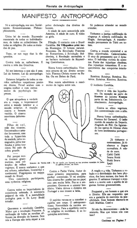 Só a antropofagia nos une. Socialmente. Economicamente. Filosoficamente. Única lei do mundo. Expressão mascarada de todos os individualismos, de todos os coletivismos. De todas as religiões. De todos os tratados de paz. Tupy, or not tupy that is the question. (Andrade, 1928, p. 3)