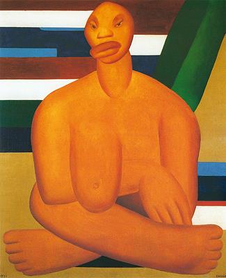O movimento antropofágico teve a sua fase pré-antropofágica, antes da pintura Pau-Brasil, em 1923, quando executei em Paris um quadro bastante discutido, a “Negra”, figura sentada com dois robustos tóros de pernas cruzadas, uma arroba de seio pesando sobre o braço, lábios enormes, pendentes, cabeça proporcionalmente pequena. A “Negra” já anunciava o antropofagismo. (Amaral, 1939, p. 42)