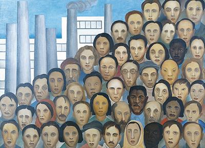 Para Herkenhoff (2019, p. 112), a disposição dos rostos na obra de maneira empilhada e estática descreve – involuntariamente – a ausência da mobilidade social existente no Brasil e aponta que a pintora não necessariamente retrata pessoas que de fato trabalham no processo de produção fabril (até porque alguns rostos são retratos de colegas de Tarsila, aristocratas e intelectuais), mas tem como objetivo maior celebrar a pluralidade da população brasileira e a imigração.